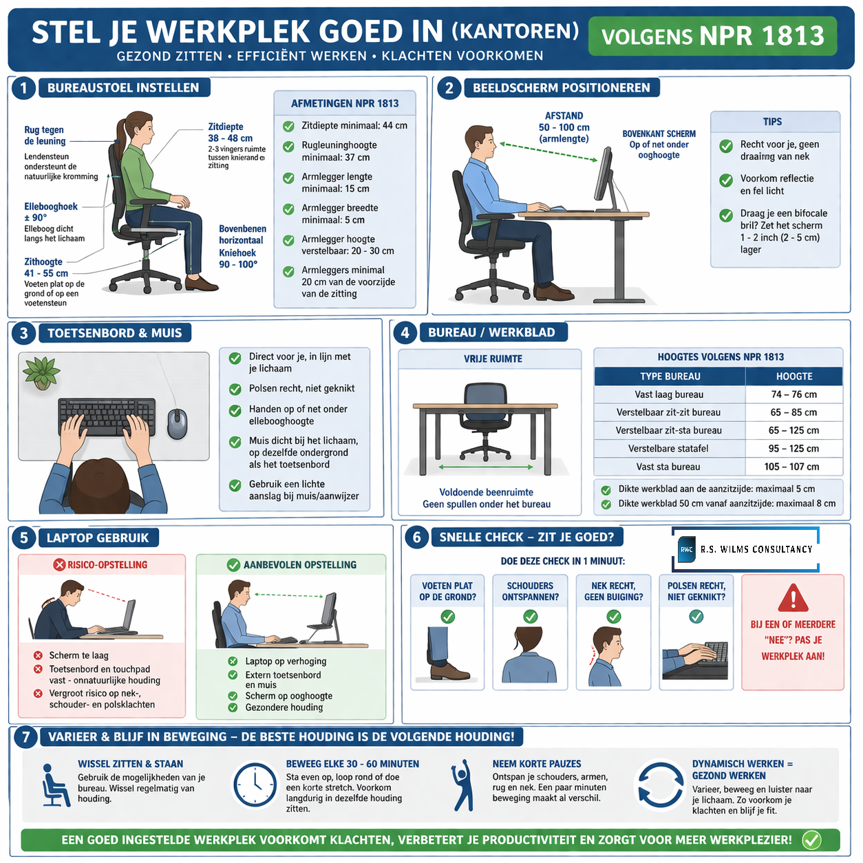 Neem daarom de tijd om uw bureau, bureaustoel en beeldscherm goed af te stellen. De Nederlandse Praktijkrichtlijn (NPR) 1813 heeft daar een richtlijn voor. Dit helpt in ieder geval om een verkeerde werkhouding te voorkomen.